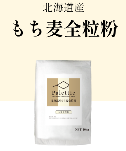 北海道で栽培した大麦の一種である、もち麦を丸ごと挽き、粉での製品化を実現しました。